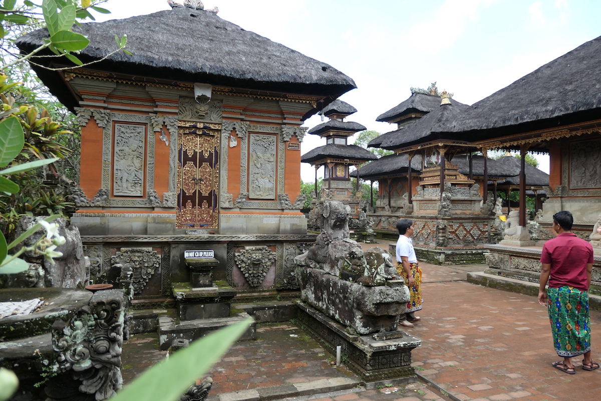 After visiting the home, we went to Puri Agung - the royal palace. The palace is today home to the royal Ksatria family and dates back to the 17th century. The Kingdom of Bali originally consisted of a number of Hindu and Buddhist areas ruled by various kings. Taken as a king heir. Today, there are few royal families left. Their function is ceremonial, for example at weddings and charities. During the visit to the royal palace we were dressed in traditional Balinese costume with sarong. We now proceeded to the center of Ubud. Made a short stop and took a walk through the market - we weren't intrigued by the city, which we had otherwise read should be one of the highlights of Bali with art and local design. Tourism had taken over - unfortunately - but our guide had prepared us for it. Now we drove to Tegenungan - a 20 meter high waterfall just east of Ubud. To get to the waterfall itself, we walked down some steep stairs in the back damp heat for it had just rained before we arrived.